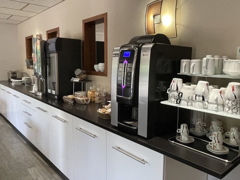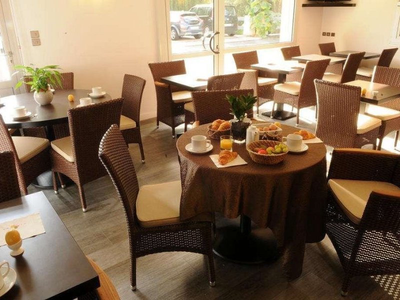 The breakfast area of our establishment offers a buffet-style breakfast with self-service, featuring a wide selection of hot beverages, fruit juices, as well as fresh sweet and savory products.